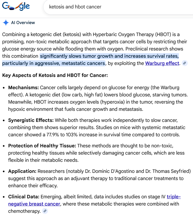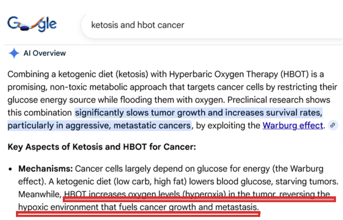 The following Google Gemini reply was given to the query “ketosis and hbot cancer”