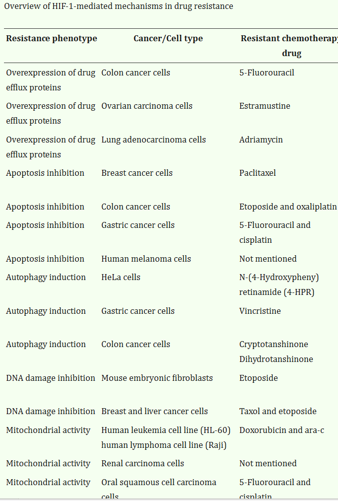 Table from X Jing, F Yang, et al. Role of hypoxia in cancer therapy by regulating the tumor microenvironment. Nvo 2019. Mol Cancer. 18 (157). https://pmc.ncbi.nlm.nih.gov/articles/PMC6844052/#CR16