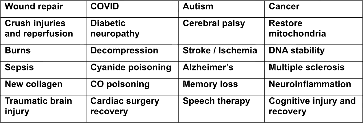 More information on various health conditions treated successfully by HBOT can be found at: