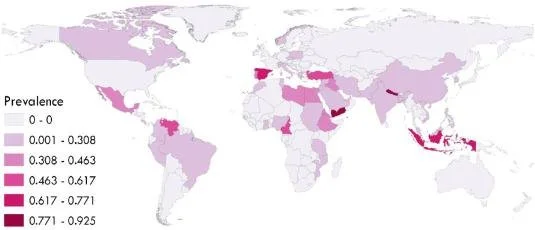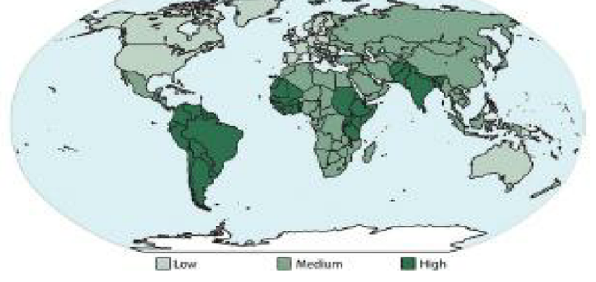Here is a map of the distribution of protozoa contamination found around the world in fruits and vegetables. [2] We see higher distribution of that contamination mostly near the equator.